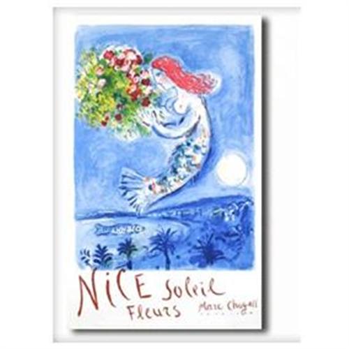 This image was commissioned by the French Tourist Office to promote publicity for Nice and the Cote d'Azure. Printed by Mourlot, this is one of the 5000 copies with the text. Chagall, who died in 1985, found lithography to be the perfect medium to express his highly creative work. Today, Chagall's post-war work is highly sought after