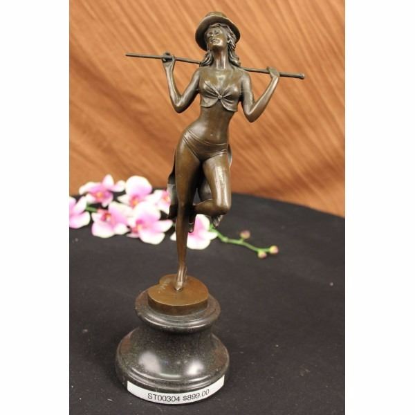 The red velvet curtain has just opened as the single spotlight shoots on the jazz dancer holding her pose before starting her lively act. She rests all her weight on her left leg as she bends her right knee to tuck her foot behind her. She is equipped with a dazzling and seductive costume; a cropped coat tail jacket, shorts, high heels and a top hat. Her arms hold a cane that she rests behind her neck giving her an air of bold spunk. There is great detail seen throughout the sculpture exhibiting the artist craftsmanship skills. The bronze sculpture was molded using the age-old method of lost-wax casting and stained with a brown patina finish for conservation. The danseur stands upon a bronze heart-shaped plinth which is all mounted upon a black marble base with the artist Aldo Vitaleh's signature. Condition: This sculpture is in very Good condition. Bronze Dimensions with Marble Base:Height 14 1/2" x Width 6 1/2" Marble Dimensions: Diameter 5" Height without base: 11" Weight : 9 LBS Inve ntory : 15-ST0034051