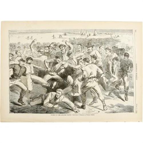 <B>Original Civil War Era Issue of </B></I><B><I>Harper's Weekly</B></I></B></I> (New York: Harper Brothers, 1865), 16 pages, elephant folio (11.5" x 16"), with the typical yellowing and very minor chipping to pages due to the high acid content of the paper. This is a July 15, 1865 issue. The cover is an engraving of “Rustic Courtship”. There is a page of engravings of “Lieutenant General Grant and Staff” and a full-page engraving of “Holiday in Camp - Soldiers Playing Foot-ball” by Winslow Homer. This issue is in very good condition.<BR><BR><BR><b>Shipping:</b> Flat Material, Large (<a target="_blank" href="http://www.heritageauctions.com/common/shipping.php">view shipping information</a>)