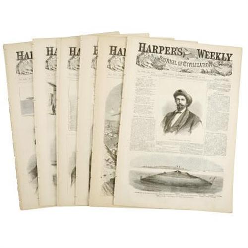 <B>Group Lot of Six Original Civil War Issues of </B></I><B><I>Harper's Weekly</B></I></B></I> (New York: Harper Brothers, 1864), about 16 pages each, elephant folio (11.5" x 16"), with the typical yellowing and very minor chipping to pages due to the high acid content of the paper. Of note is a January 2, 1864 issue with full page engravings of various balloons and scenes of the Army of the Potomac; a January 30, 1864 issue with a full page engraving of emancipated slaves in New Orleans; an April 2, 1864 edition with a full page engraving of General Sherman’s rear guard; an April 30, 1864 edition with a double page Thomas Nast engraving of the press in the field; an August 27,1864 edition with a double page Thomas Nast engraving of Central Park in the Summer; and a September 24, 1864 edition with a double page Thomas Nast engraving of The Blessings of Victory. These are in very good condition.<BR><BR><BR><b>Shipping:</b> Flat Material, Large (<a target="_blank" href="http://www.heritageauctions.com/common/shipping.php">view shipping information</a>)