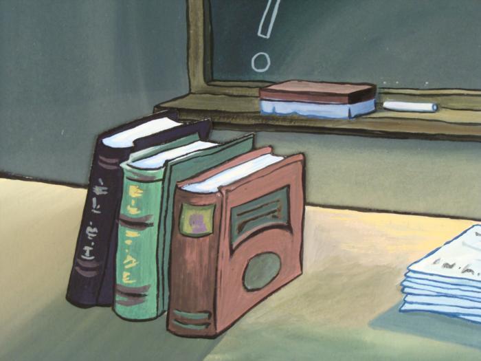 This original hand-painted background and animation cel are from the Nickelodeon TV show SpongeBob Squarepants. The story takes place under the deep blue sea in Bikini Bottom, where SpongeBob resides. SpongeBob, who is a yellow, porous sponge, is your typical happy-go-lucky character, as he is always cheerful and enjoys making people laugh. Patrick Star, SpongeBob's neighbor who is a starfish, is your average children's show idiot, as he boasts knowing nothing and is often getting himself into ridiculous situations. Between the homes of these two lies the home of the miserable Squidward, a squid, who is known for being grouchy and playing tricks on SpongeBob and Patrick. Both SpongeBob and Squidward work at the Krusty Krab, a fast food business run by the greedy money-loving Mr. Krabs, a crab, the arch rival of the evil, possibly misunderstood, Plankton. Another neighbor, Sandy Cheeks, an athletic squirrel who normally wears an astronaut's space suit, was introduced in "Tea at the Treedome." She spends most of her time inventing and experimenting. Class is now in session, everyone please take your seat. Original Production Background and Animated Cel Overall Size of Background: 10 1/2" x 21 1/2" Overall Size of the Cels: 10 1/2" x 22" Very good condition; it has been stored rolled This is an original hand-painted cel set-up used in the production of an episode of "SpongeBob SquarePants." Each one-of-a-kind set-up represents a slight change in position of the characters. When individually photographed and projected in rapid succession, the images appear to move.