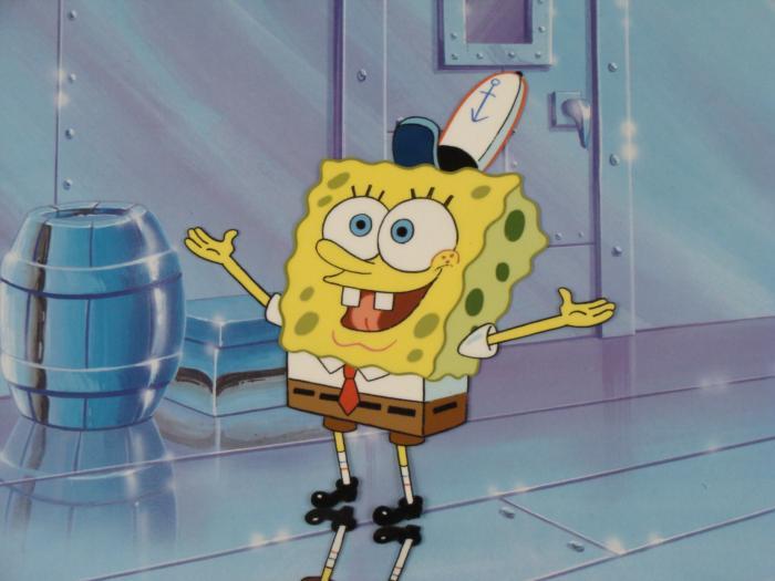 This animation cel and reproduction background are from the Nickelodeon TV show SpongeBob Squarepants. The story takes place under the deep blue sea in Bikini Bottom, where SpongeBob resides. SpongeBob, who is a yellow, porous sponge, is your typical happy-go-lucky character, as he is always cheerful and enjoys making people laugh. Patrick Star, SpongeBob's neighbor who is a starfish, is your average children's show idiot, as he boasts knowing nothing and is often getting himself into ridiculous situations. Between the homes of these two lies the home of the miserable Squidward, a squid, who is known for being grouchy and playing tricks on SpongeBob and Patrick. Both SpongeBob and Squidward work at the Krusty Krab, a fast food business run by the greedy money-loving Mr. Krabs, a crab, the arch rival of the evil, possibly misunderstood, Plankton. Another neighbor, Sandy Cheeks, an athletic squirrel who normally wears an astronaut's space suit, was introduced in "Tea at the Treedome." She spends most of her time inventing and experimenting. SpongeBob has made the room clean.Original Printed Background and Animated Cel Overall Size of Background: 10 1/2" x 17" Overall Size of the Cel: 10 1/2" x 12 1/2" Very good conditionThis is an original hand-painted cel set-up used in the production of an episode of "SpongeBob SquarePants." Each one-of-a-kind set-up represents a slight change in position of the characters. When individually photographed and projected in rapid succession, the images appear to move.