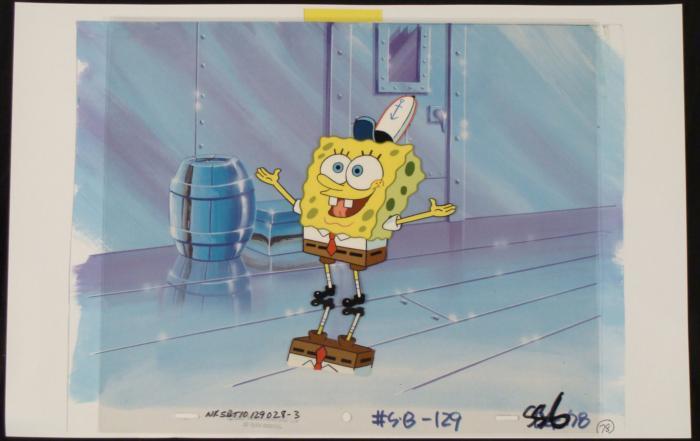 This animation cel and reproduction background are from the Nickelodeon TV show SpongeBob Squarepants. The story takes place under the deep blue sea in Bikini Bottom, where SpongeBob resides. SpongeBob, who is a yellow, porous sponge, is your typical happy-go-lucky character, as he is always cheerful and enjoys making people laugh. Patrick Star, SpongeBob's neighbor who is a starfish, is your average children's show idiot, as he boasts knowing nothing and is often getting himself into ridiculous situations. Between the homes of these two lies the home of the miserable Squidward, a squid, who is known for being grouchy and playing tricks on SpongeBob and Patrick. Both SpongeBob and Squidward work at the Krusty Krab, a fast food business run by the greedy money-loving Mr. Krabs, a crab, the arch rival of the evil, possibly misunderstood, Plankton. Another neighbor, Sandy Cheeks, an athletic squirrel who normally wears an astronaut's space suit, was introduced in "Tea at the Treedome." She spends most of her time inventing and experimenting. SpongeBob has made the room clean.Original Printed Background and Animated Cel Overall Size of Background: 10 1/2" x 17" Overall Size of the Cel: 10 1/2" x 12 1/2" Very good conditionThis is an original hand-painted cel set-up used in the production of an episode of "SpongeBob SquarePants." Each one-of-a-kind set-up represents a slight change in position of the characters. When individually photographed and projected in rapid succession, the images appear to move.