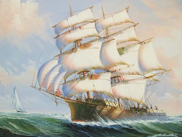 Original Clipper Ship Painting by Davis, signed by artist and measures 24'' x 36'', some cracking in paint, on canvas