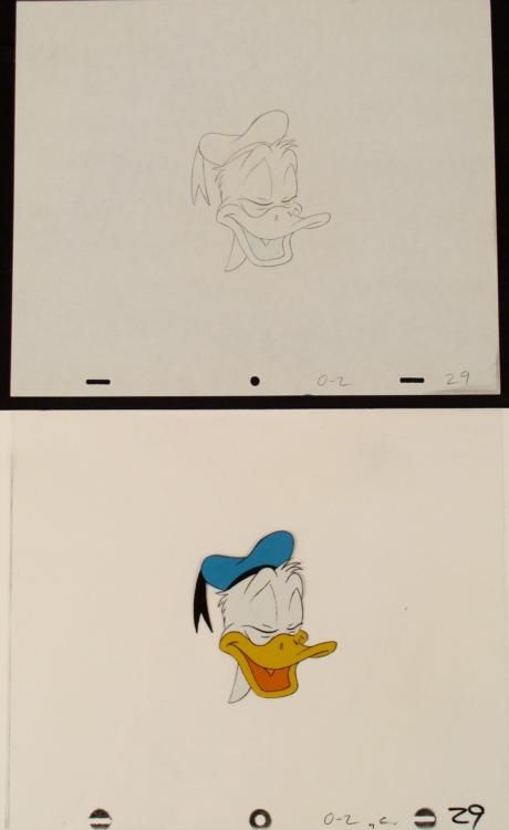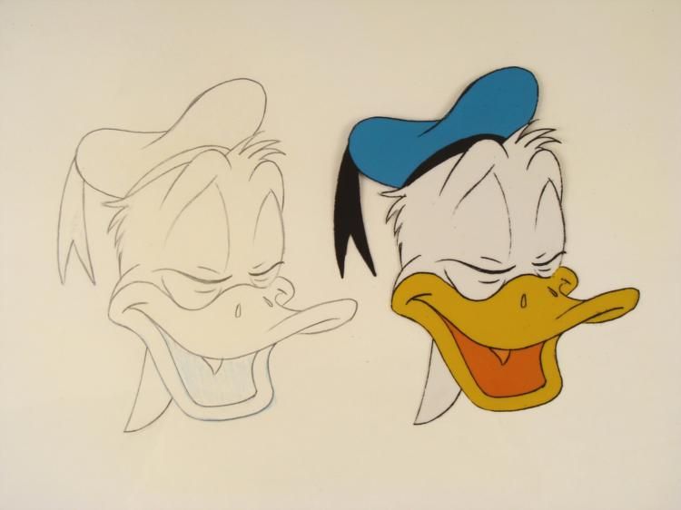 Closed eyed Donald Duck * * * * * Original Animation Cel & DrawingMedium: Hand painted acetate celDetails: Animation notations and peg holes * * Original "rough" animation drawing, in non-photo blue and black pencil * * Size of cel: 10 1/2 x 12 1/2 inchesSize of drawing: 10 1/2 x 12 1/2 inches * * Condition: Very good * This is an original hand-painted cel set-up used in the production of the "Walt Disney Shows." Each one-of-a-kind set-up represents a slight change in position of the characters. When individually photographed and projected in rapid succession, the images appear * to move. To created production cels, the original animator's drawing is transferred onto an acetate cel (by hand-inking and/or photo copying). The cel is then hand-painted on the reverse side. * * * * Traditional animation is a multi-step process which includes various types of art techniques. Drawings are a key part of the process, in which the animator creates the design and movement of the characters. Drawings are then transferred onto acetate cels * (by hand-inking and/or photo copying) to create a production cel, which is then hand painted on the back side, using paint colors chosen and approved by the creator of the series.