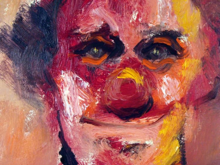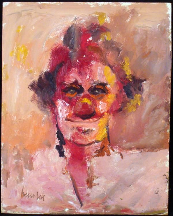 This clown painting has a very pink and red tone, and eyes that will stare you down. Artist: Signed, lower left Medium: Acrylic on boardDate: Appears to be 1983Size: 16 x 21 1/2 inchesCondition: Excellent