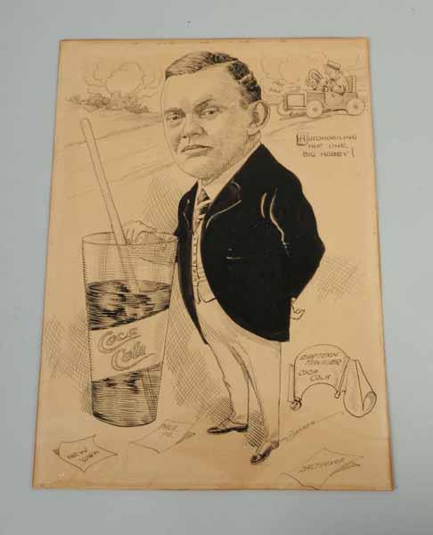 Description Circa 1920s. Large caricature of the Eastern U.S. Coca-Cola manager depicted beside an oversized early flare glass. Great graphics. Shows a vignette in upper right corner, showing his favorite hobby of automobiling. Only minor soiling, light stains, some spots, and light wear. Condition (8.0, Excellent). Size 14" x 19".