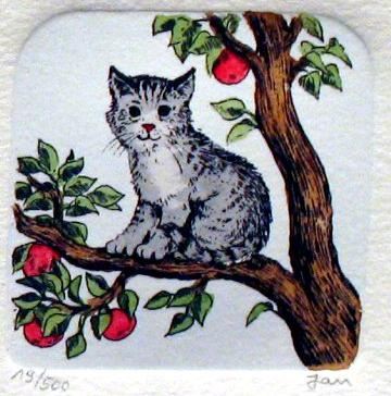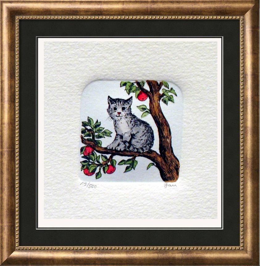 Elizabeth Jan | Title Of Art: Kitty In Tree | Medium: Hand Signed By The Artist Etching On Paper | Edition #: 19/500 | Unframed Size: 4 X 4 Inches | Framed Size: Unframed | Value: $ 150