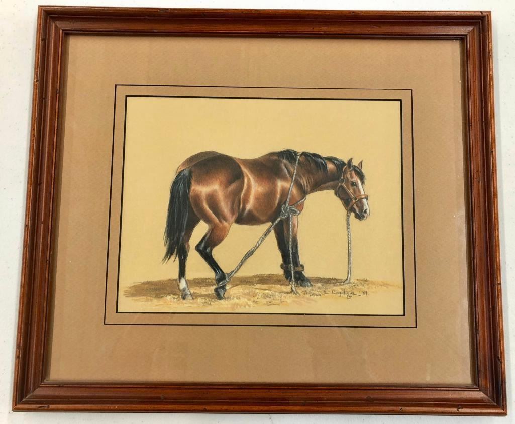 For your bidding pleasure is this original colored pencil drawing by Cynthia Rigden. This drawing features a gorgeous quarter horse getting an education. In 2016, the owner of this item had it appraised for $900. Cynthia Rigden grew up surrounded by horses and cattle on the 8,000 acre ranch that has been in her family since 1902. Her roots in Arizona and the West are deep. Yet, she doesn't call herself a "western artist". Rather, she is an artist who comes from the West. Maker: Cynthia Rigden. Approx. Age: Fairly modern. Size: Artwork is 8"x10" while it is 16-1/4" wide X 14" tall with the frame. Condition: Good, minimal wear expected. Please look closely at the pictures - they are an important part of our description. Shipping: There will be a $10 handling / packaging fee for shipping this lot. The actual cost of postage will be added on top of that. BUY IT NOW: If you would like to buy this item now without waiting for the auction to end (this option is only available up to 48 hours before the auction starts to close), the “Buy it Now” price is the high estimate of this lot. If you would like to end the auction early and pay the high estimate (plus applicable fees), please contact us by phone or email and reference this lot number.