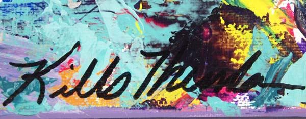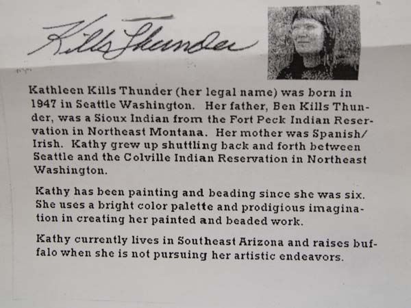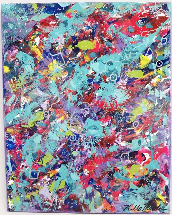 Original Colorful Abstract Art by Kills Thunder. Titled ''Turquoise Crush'' This item measures approx. 20'' x 16'', Artist Bio: Kathleen Kills Thunder was born in Seattle, Washington. Kathy has been painting and beading since she was six. She uses bright color palette and prodigious imagination in creating her painted and beaded work. Kathy currently lives in Southeast Arizona and raises buffalo when she is not pursuing her artistic endeavors.