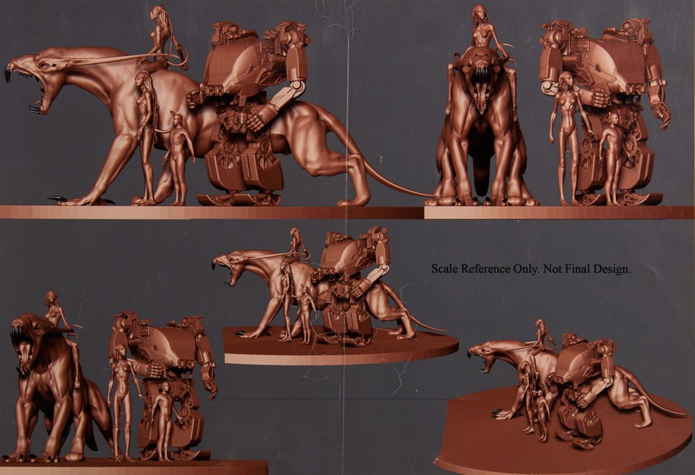 AVATAR. (20th Century Fox, 2009) Computer generated designs of two Na'vis (perhaps Neytiri, Zoë Saldana's character), a Thanator (a panther-like beast), an AMP (Amplified Mobility Platform) suit, and a human. The concept designs are marked as "Scale Reference Only. Not Final Design." This indicates that the images are for size comparisons. However, despite the "Not Final Design" disclaimer, we can see that the concepts are very close to what we eventually see in the final film version. Inkjet print on photographic paper measuring 13" x 19". Vertical crease mark along the center with some emulsion cracks. Otherwise, still in good condition. A fantastic piece of memorabilia from one of the highest grossing films of all-time and certainly one that changed film making technology forever. From the personal collection of Anthony Almaraz, who was a costumer on the film.
