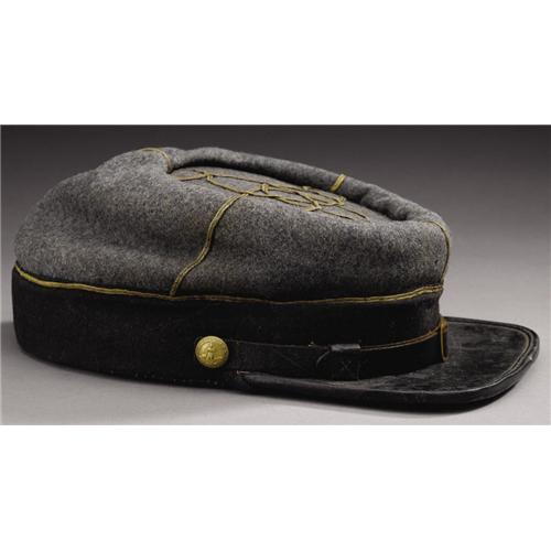 <B>Virginia Lieutenant's Regulation Confederate Kepi,</B></I> 7” wide x 10” long, grey wool crown and sides with black wool trim, single gold braid indicating rank and forming a quatrefoil on the crown, patent leather visor, leather chinstrap with a small brass buckle secured by two 16mm Virginia gilt buttons (backmark not visible). The interior has a wide brown leather sweatband and is lined with a butternut cotton fabric. Overall this classic Confederate officer's kepi is quite sound and in much better condition than most surviving Civil War headgear. Fewer than half a dozen pinholes dot the grey wool, these being along the edge of the hatband and, as such, nearly invisible. The exterior leather has minimal crazing throughout and one fold line along the visor. The buttons have a rich, never-cleaned gilt patina. The interior is somewhat soiled from use. All stitching is tight. This kepi presents an excellent opportunity to own a museum quality Confederate officer's kepi.<BR><BR><B>Provenance:</B></I> <I>The Tharpe Collection of American Military History</B></I><BR><BR><B>Exhibited:</B></I> <I>The Liberty Heritage Society Museum</B></I><BR><BR><b>Shipping:</b> Miscellaneous Collectibles, Smal (<a target="_blank" href="http://www.heritageauctions.com/common/shipping.php">view shipping information</a>)