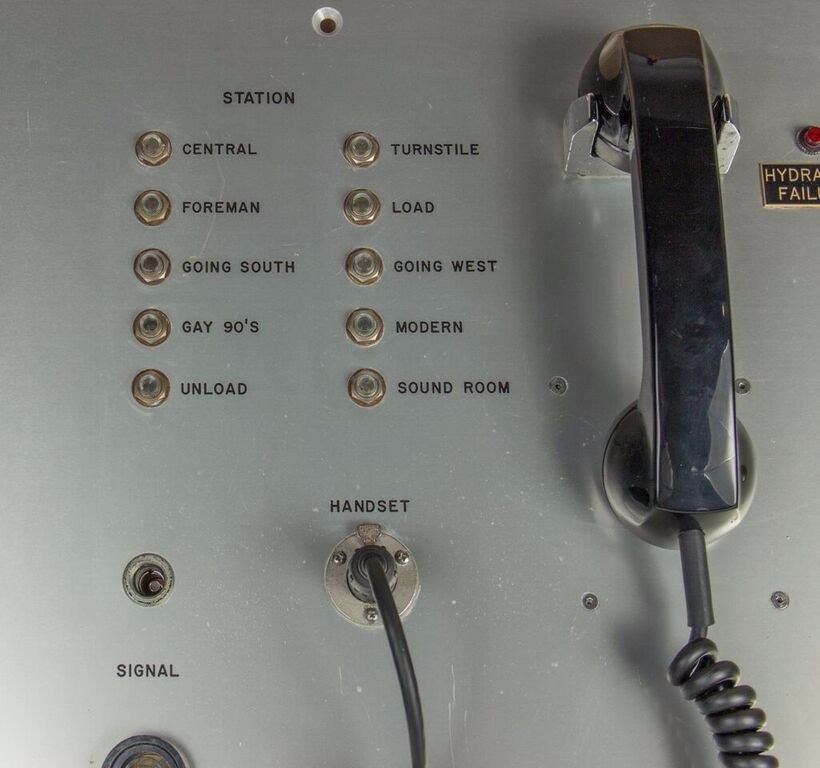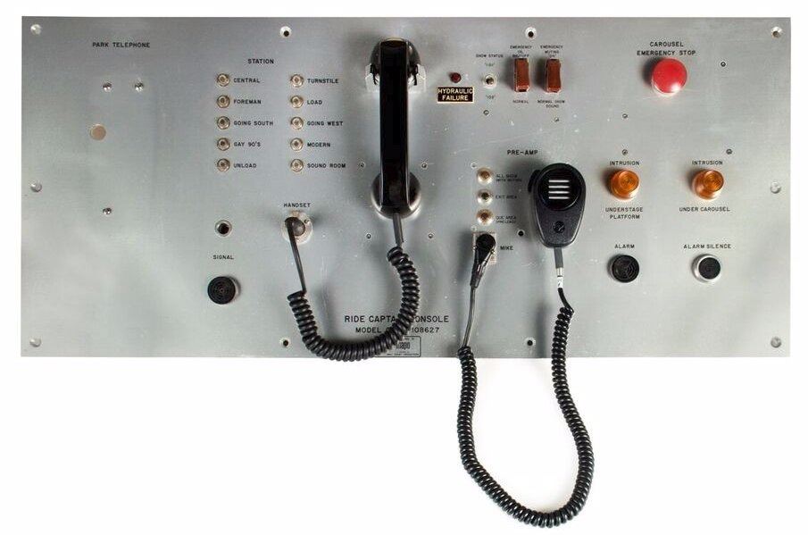 (Disneyland, 1988) An extremely rare original attraction control console used in the "America Sings" attraction at Disneyland. This control console is labeled "Ride Captain Console" and features MAPO's manufacturing logo near the bottom. The console features the many switches, buttons, and other various controls needed to operate the attraction. The console is labeled for ease of use, and phrases such as "Carousel Emergency Stop", "Intrusion Under Carousel", "Exit Area", and "Hydraulic Failure" can be seen throughout. The console contains a handset and a microphone, and the backside of the console still holds the mechanics used to operate it. Functionality of the console and completeness of the mechanics on the back have not been tested. The console measures 16.25"x36.75" and is in very good condition with expected minor wear from park use.