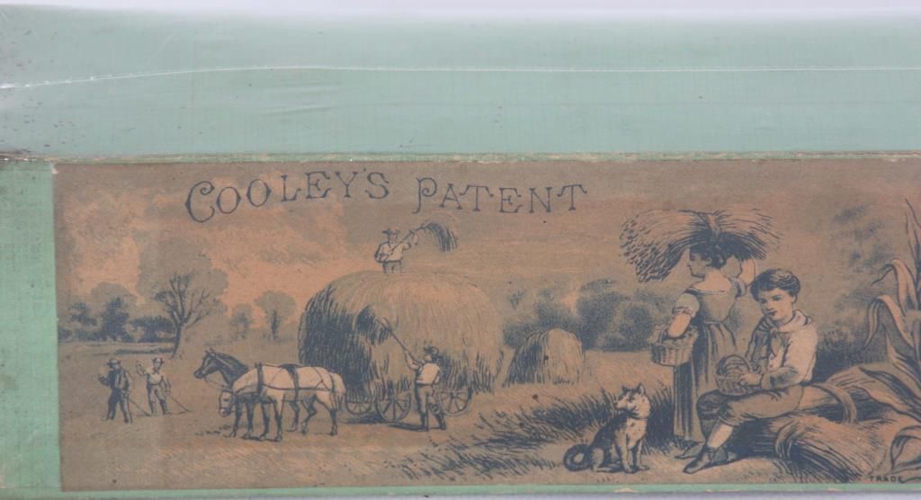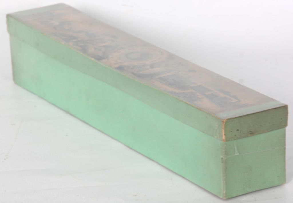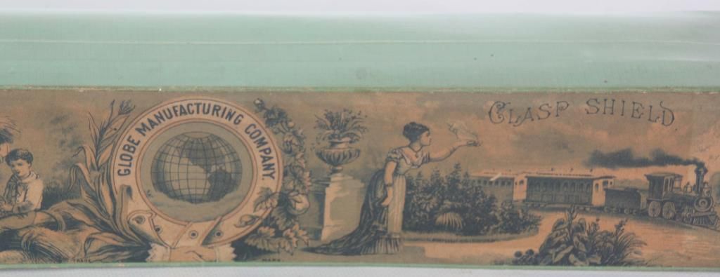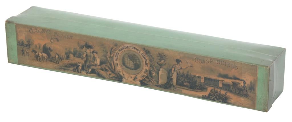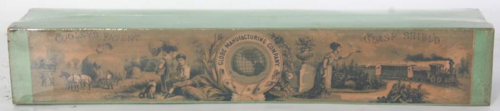 Original Cooley’s Patent Clasp Shield in Box. Original green box with lithograph on the lid with farm scene to the left and train scene to the right and centered with a round Globe Manufacturing Company logo; on the left end of the box is the original size “18” label. Box is shrink wrapped for protection. 3 in. high x 16 in. long x 2.75 in. deep.