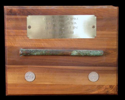 Original Copper Spike from USF Constellation 1797, plus 2 US Commerative Coins mounted on wooden plaque 12 x 15
