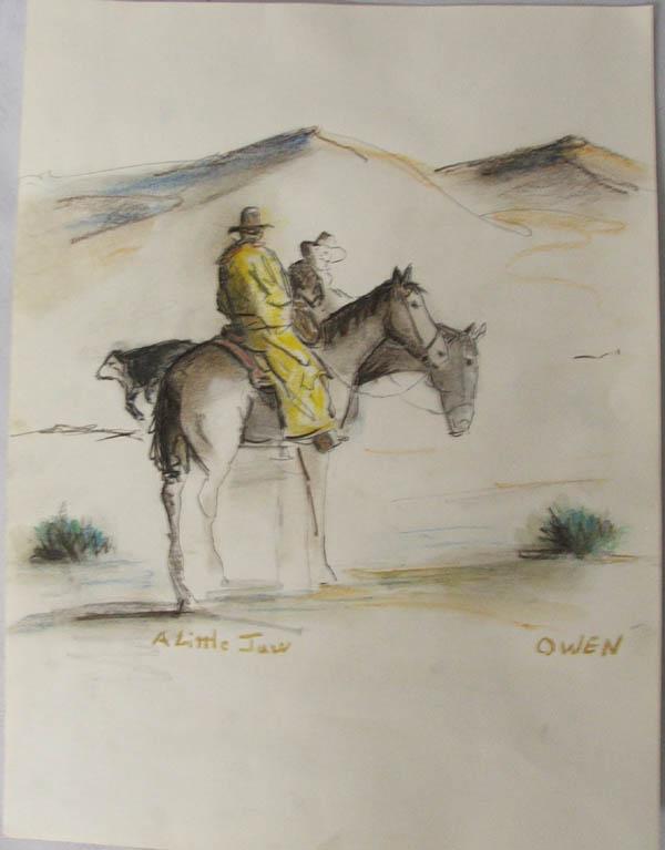 Original Cowboy Drawing By Owen, titled "A Little Jaw". Measures approx. 12" x 9". SHI $25.