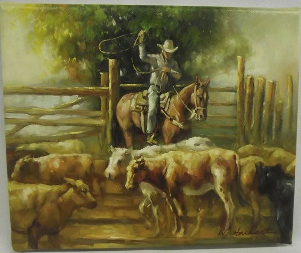 Original Cowboy Oil Painting by W. Hackert, measures 10'' x 8'', depicts cowboy roping steers for branding, well sought after western artist
