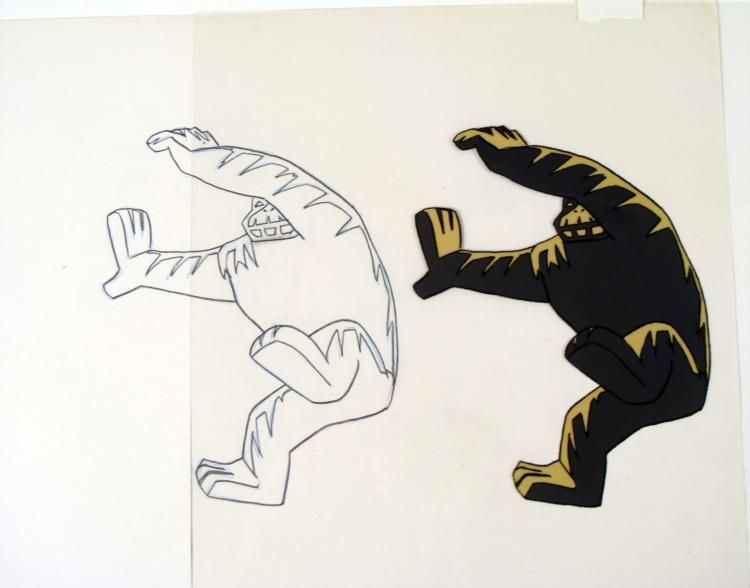 The Herculoids battled to defend their planet from menaces on Amzot/Quasar and from outer space. All of the Herculoids displayed Human-level intelligence - employing precision teamwork and complex tactics - as well as emotions, and Zandor and Tara both * displayed a working knowledge of complex alien technologies as well as the ability to pilot interstellar spacecraft—but essentially, Zandor, Tara, Dorno, and the Herculoids were fighting to keep Amzot/Quasar a technology-free, primitive planet. This is further * indicated by the pseudo-barbarian outfits of Zandor, Tara, and Dorno and the fact that technology was used mainly by the various villains, but rarely if ever by the heroes. Although the "speech" of their companions was limited and repetitive, Zandor, Tara * and Dorno demonstrated that Gloop and Gleep, at least, had a comprehensive mode of communication, and that they could at least understand and interpret this language. * * * * **The cel and drawing are at least 35 years old. * * * * Watch out, a ton of rock is about to come crashing down... * * * Original Animation and Drawing * * Original "rough" animation drawing, in non-photo blue and black pencil with the notations in non-photo blue and black. * * * Overall Size of Drawing: 10 1/2" x 12 1/2" * Overall Size of the Cel: 10 1/2" x 12 1/2" * Excellent condition * This is an original hand-painted cel set-up used in the production of an episode of "Herculoids." Each one-of-a-kind set-up represents a slight change in position of the characters. When individually photographed and projected in rapid succession, the images * appear to move. * * To create production cels, the original animator's drawing is transferred onto an acetate cel (by hand-inking and/or photo copying). The cel is then hand-painted on the reverse side. * * * * * The drawing and cel are ready to be matted and framed. The notations are located at the bottom of the drawing and cel. * *