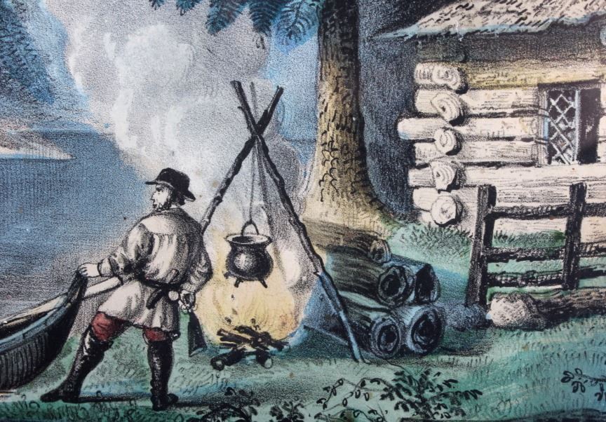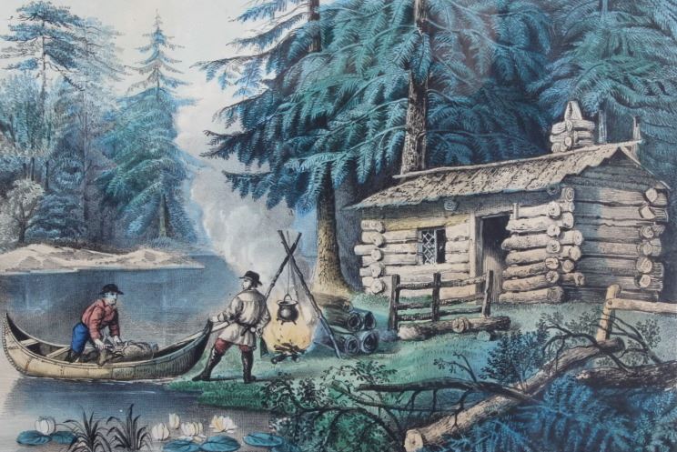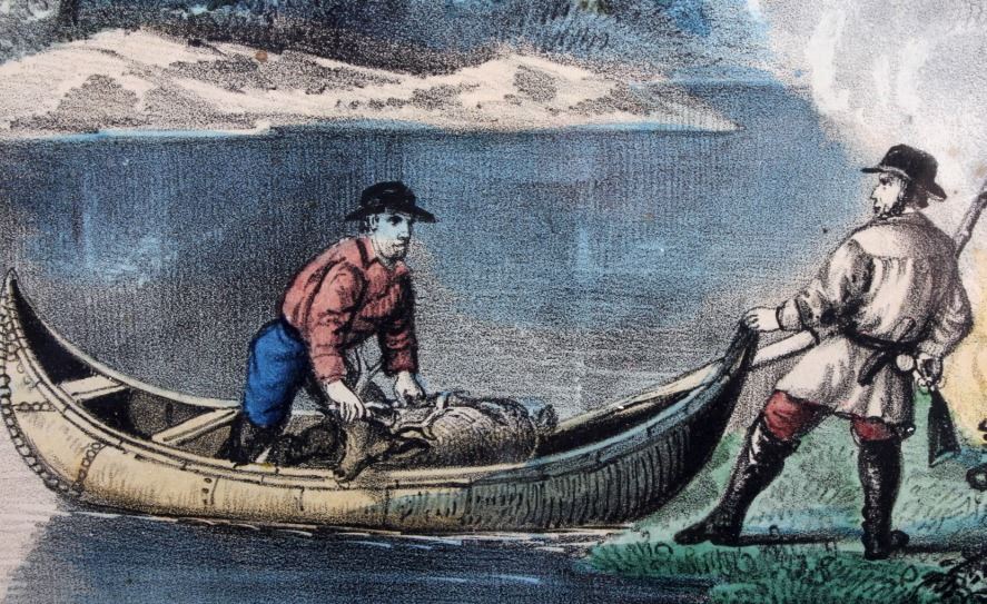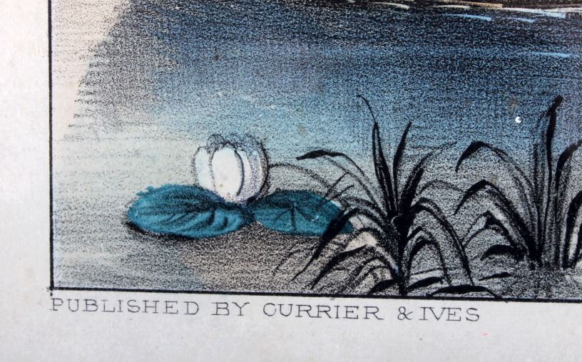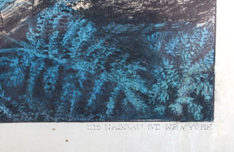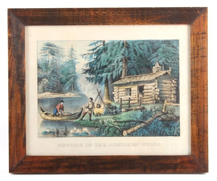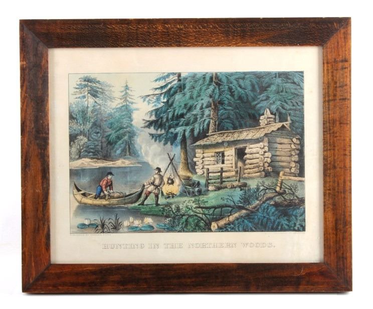 This is an original Currier & Ives hand tinted lithograph titled "Hunting in the Northern Woods" from circa 1870. Nathaniel Currier and James Merritt Ives were founders of the successful printmaking firm in New York City from 1857-1907 called The Grand Central Depot for Cheap and Popular Prints. Their lithographs have endured the times and are highly sought after in today's collectible markets. This piece shows two hunters pulling their canoe ashore after a successful deer hunt. The bottom left corner is marked "Published by Currier & Ives" and the bottom right corner is marked "125 Nassau St. New York". The bottom of the lithograph reads "Hunting in the Northern Woods". The piece has been professionally framed. The Currier & Ives lithograph is in good condition. The frame measures 14.25" x 17.25".
