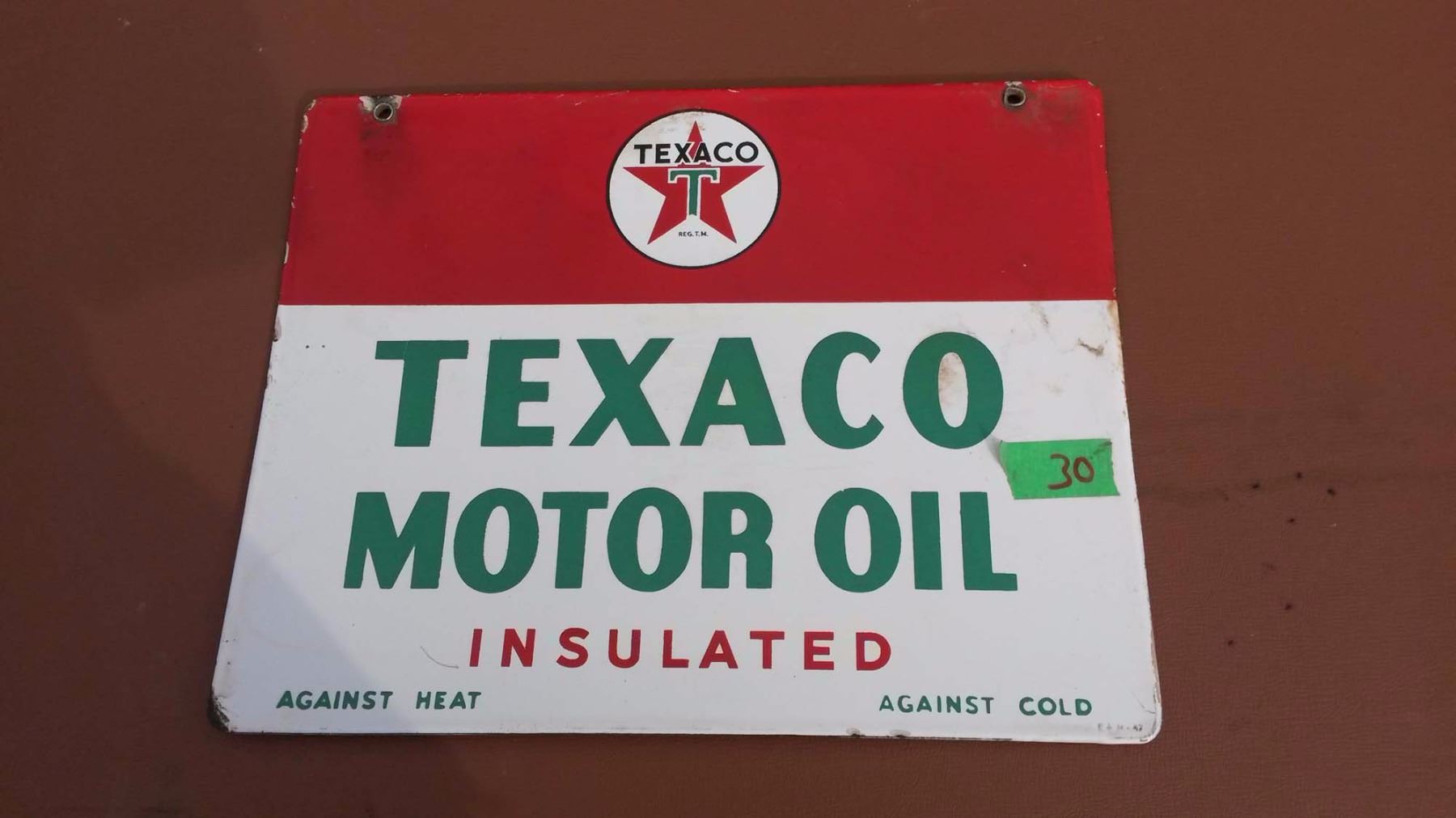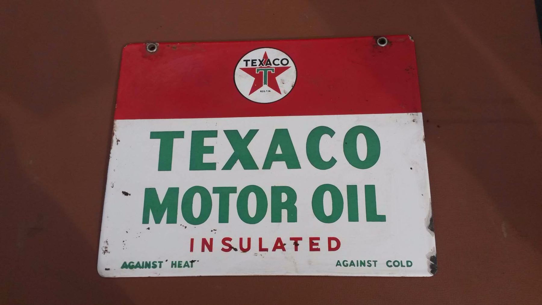Original DS Porcelain Texaco Motor Oil Sign, Stamped 1947 (14”x11”)