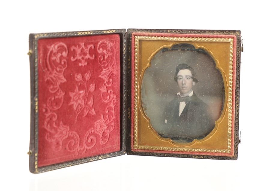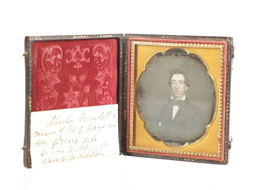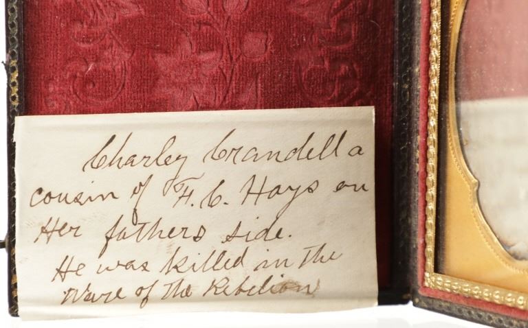For your consideration is this 1850-1880s daguerreotype portrait photo of a Civil War soldier named Charley Grandell, a cousin of H. G. Hays on her fathers side. The case shows intricate embossed designs around a center piece of an eagle and the American flag shield. One side of the interior shows a wine red colored felt with floral designs, while the other side houses the photo of Charley Grandell. Grandell was supposedly killed in action during his time in he Civil War. The photo and case show good condition overall with some wear to the case from its age and use over the years but no obvious signs of damage are noted. The case measures 3 11/16" L x 3 1/4" W x 9/16" D and weighs 108.8 grams.