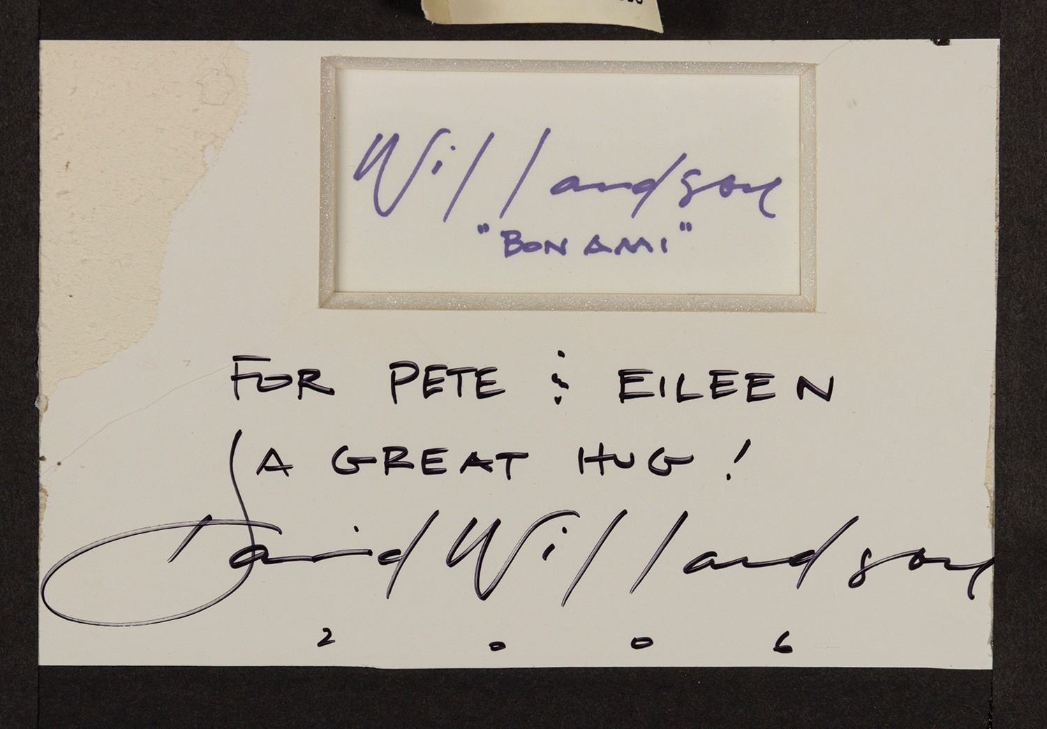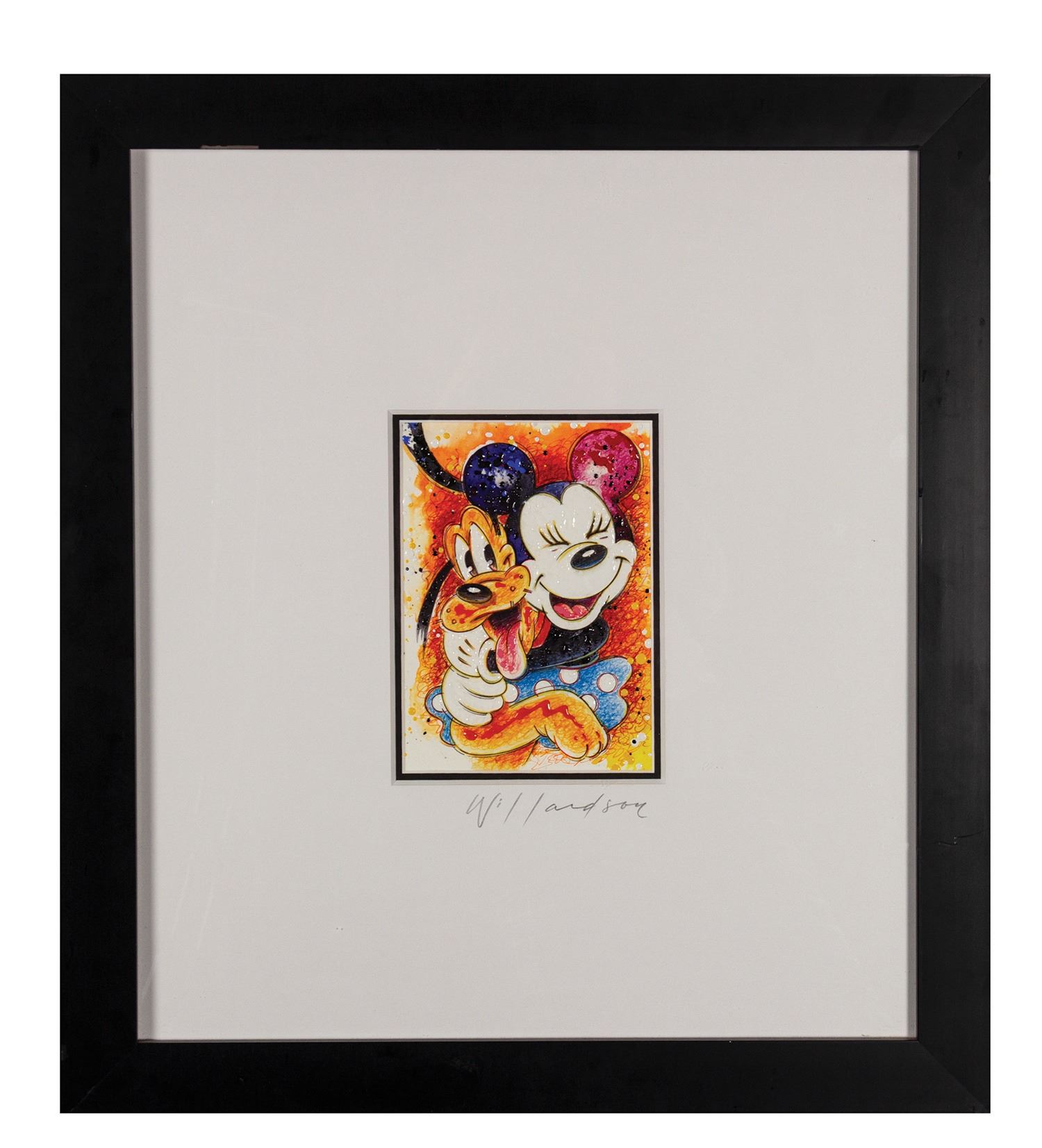 (Willardson, c.2006) An original painting by David Willardson of Minnie Mouse and Pluto. Willardson is known for his use of acrylic highlights and splatters, as seen in this original painting. The artwork is signed by Willardson on the mat, as well as on the back with the title of "Bon Ami" visible through a cut-out of the foamcore on the back of the frame. It is personalized "For Pete & Eileen" and signed a third time on the foamcore backing. The image is accomplished in ink and acrylic and measures 7"x5" in the 21.25"x19.25" frame. It is unexamined out of frame to preserve the signatures, but appears to be in very good condition. The frame is in fair condition with some chipping around the edges.