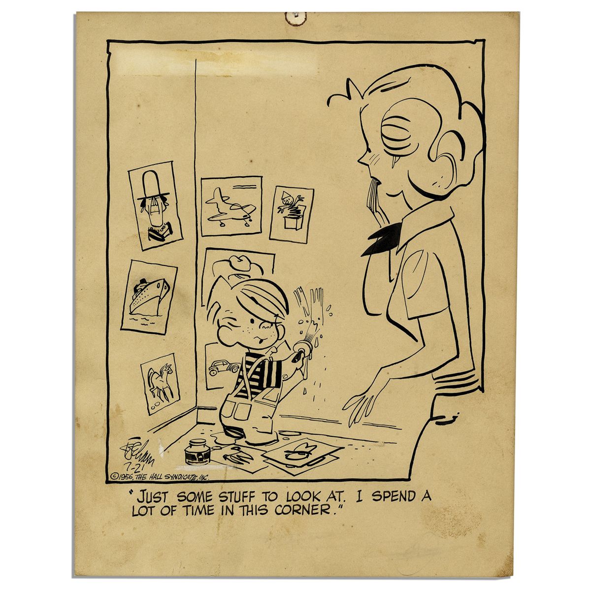 Rare Hank Ketcham ''Dennis The Menace'' comic strip signed and dated 21 July 1956. Single frame Saturday strip depicts young Dennis gluing his drawings to the wall as his mom Alice Mitchell catches him in disbelief. The mischief-loving Dennis wears his signature overalls and striped t-shirt. Caption at bottom reads, ''Just some stuff to look at. I spend a lot of time in this corner.'' With a 1956 Hall Syndicate copyright at lower left. Measures 7.5'' x 9.75'' with some toning and foxing, and a pin hole to top center, else very good condition overall.