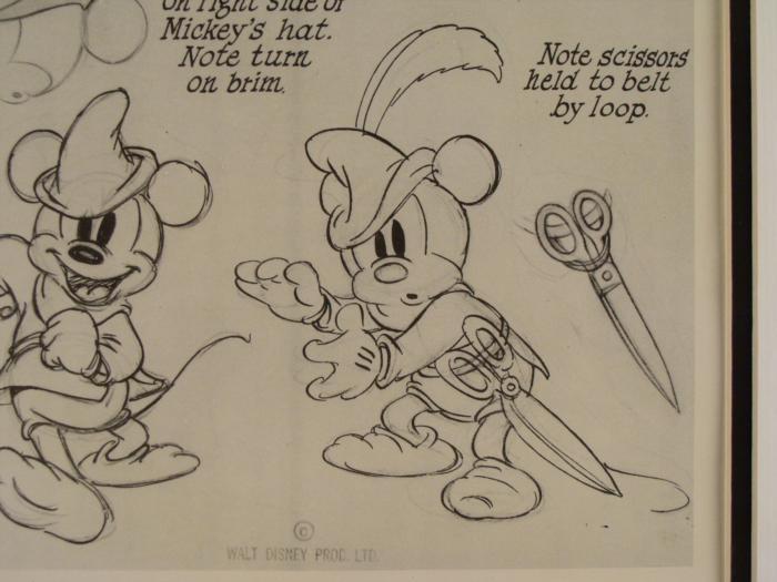 This is an original period production art photostat of a model sheet drawing from the 1937 Disney animated short film Brave Little Tailor. Model sheets were passed around to the various departments in the Disney production studios to maintain consistency among the different animators. This particular sheet depicts various poses of Mickey Mouse. It has detailed animator notations that let you see how the drawings were created. It also has the signed names of the Director, Story editor, and Animator, suggesting that this sheet went to the top people on the project. Medium: Photostat on paper Matting: Double matted in black and whiteImage area: 9 1/8 x 11 1/2 inches Framing: Brown tone wood frame Frame size: 17 1/2 x 19 7/8 inches Condition: Excellent, with minor tear-through at the center (note: model sheets were designed to be used, and they often got worn or discarded) Model sheets such as this were used in the creation of animation, and it provides a unique glimpse into the production process. Traditional animation is a multi-step process, of which drawings are a key part. The animator creates the design and movement of the characters from drawings, and these drawings are then transferred onto acetate cels to create a production cel.