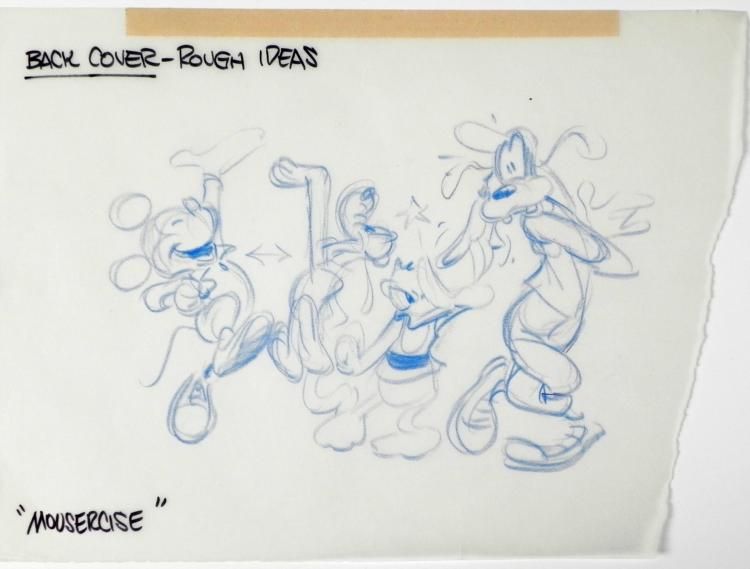 Mickey and Friends is the official name of the Mickey Mouse character cast. These characters are the most famous Mickey Mouse characters in Disney History. The replaced the original group in 2006.The group's main characters * are Mickey Mouse, Minnie Mouse, Donald Duck, Daisy Duck, Goofy and Pluto. Together they make the Sensational Six. * * * * Part of "Sensational Six" (Mickey, Donald, Pluto, and Donald) are depicted in this drawing. They are all movin' and groovin' and having one heck of a time! It's what we like to call "Mousercise." * * * * Original "rough" animation drawing on wax paper, in non-photo blue * with the notations in black sharpie * * Overall Size: 8 1/2" x 11 3/4" * * Very Good condition * Traditional animation is a multi-step process which includes various types of art techniques. Drawings are a key part of the process, in which the animator creates the design and movement of the characters. Drawings are then transferred onto acetate cels * (by hand-inking and/or photo copying) to create a production cel, which is then hand painted on the back side, using paint colors chosen and approved by the creator of the series. * * * This drawing is ready to framed and matted. * The animator's notations are located at the top and bottom of the drawing. The right side of the drawing appears to have been ripped off. *