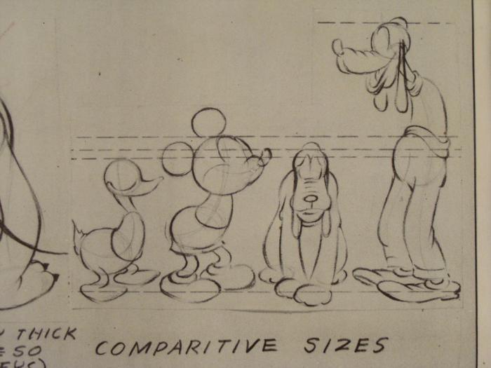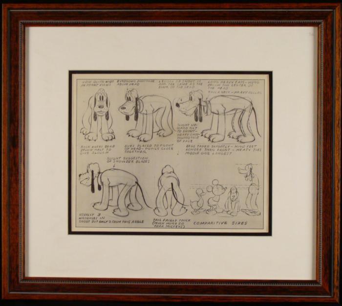 This is an original period production art photostat of a model sheet drawing from a 1939 era Disney animated feature film. Model sheets were passed arouto the various departments in the Disney production studios to maintain consistency among the different animators. This particular sheet depicts various angles of Pluto. It is also filled with detailed animator notations that let you see how the drawings were created. There is also a comparison size visual with Donald Duck and Mickey Mouse. Medium: Photostat on paper Matting: Double matted in black and whiteImage area: 9 1/8 x 11 1/2 inches Framing: Brown tone wood frame Frame size: 17 1/2 x 19 7/8 inches Condition: Excellent, with minor tear-through at the center (note: model sheets were designed to be used, and they often got worn or discarded) Model sheets such as this were used in the creation of animation, and it provides a unique glimpse into the production process. Traditional animation is a multi-step process, of which drawings are a key part. The animator creates the design and movement of the characters from drawings, and these drawings are then transferred onto acetate cels to create a production cel.