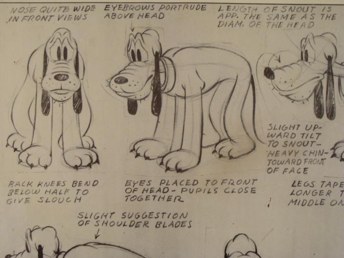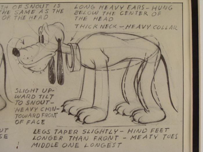 This model sheet was from a feature that would have starred Mickey Mouse, Goofy, and Donald Duck. It is a wonderful portrayal of Mickey's faithful dog.