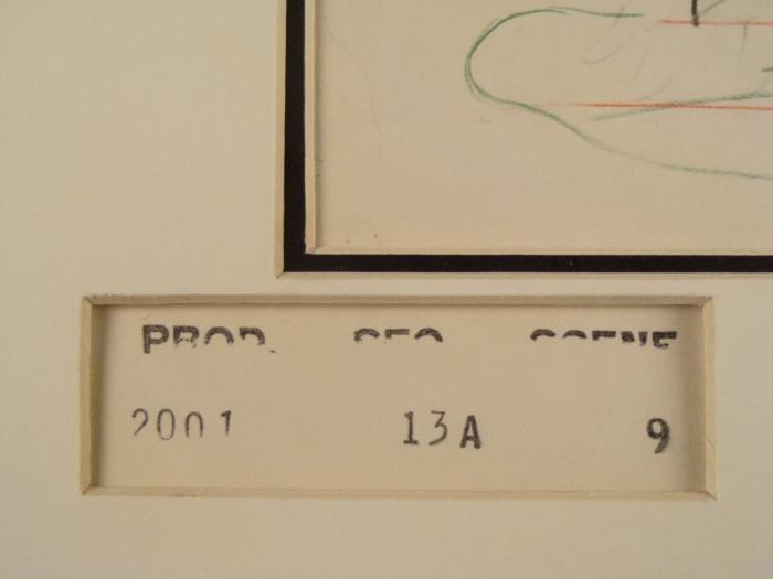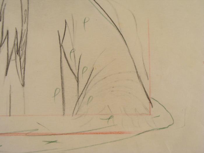 This is an original production drawing of the witch from the 1937 Disney animated feature film Snow White and the Seven Dwarves. This drawing depicts the evil witch in all of her wickedness, with her wide-eyed stare gazing right at the viewer. A few lines appear to have been erased, including the outlines of her hands. This shows the way the animation evolved in development. Medium: Graphite, red, and green pencil on paper Matting: Double matted in black and white; cut-through section exposing stamped scene information Production number: 2001 Sequence number: 13A Scene number: 9Image area: 7 1/2 x 9 7/8 inches Framing: Gold painted wood frame Frame size: 16 1/4 x 18 7/8 inches Condition: Excellent Production drawings such as this were used in the creation of animation, and it provides a unique glimpse into the animator's creative process. Traditional animation is a multi-step process, of which drawings are a key part. The animator creates the design and movement of the characters from drawings, and these drawings are then transferred onto acetate cels to create a production cel.