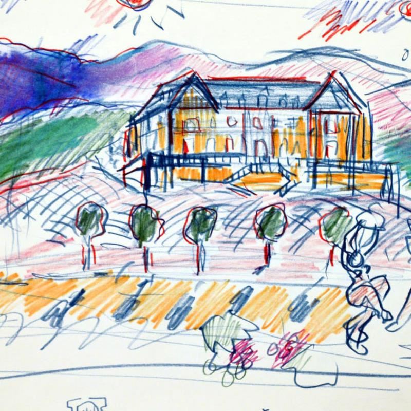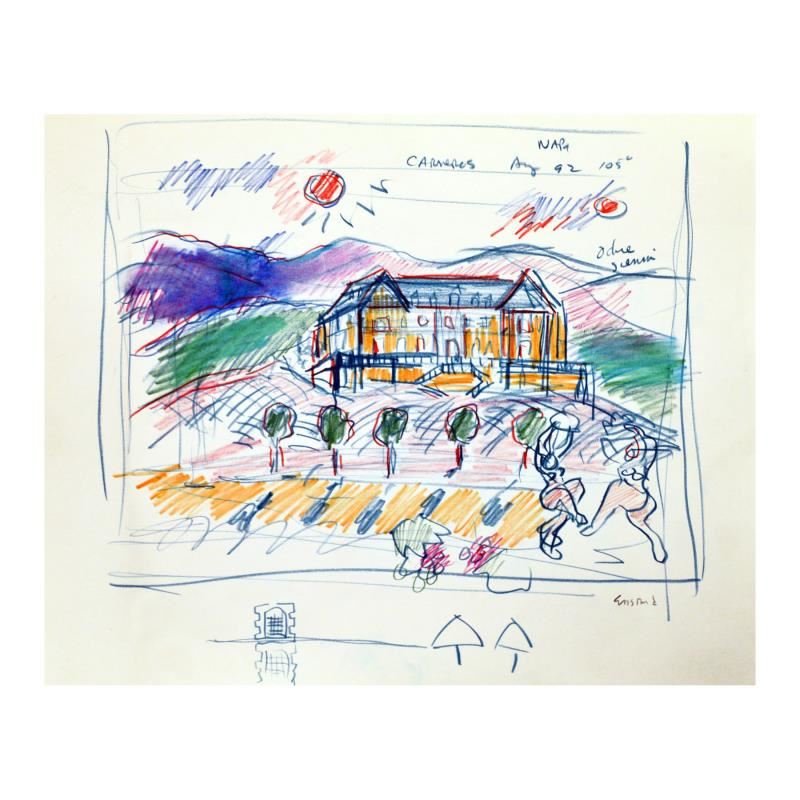"Domaine Carneros, Napa Valley" is an original Mixed Media on Paper by Wayne Ensrud. The piece is hand signed by the artist and comes with a Certificate of Authenticity. Measures approximately 14" x 17".