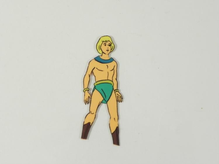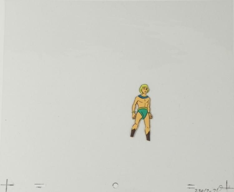 The Herculoids battled to defend their planet from menaces on Amzot/Quasar and from outer space. All of the Herculoids displayed Human-level intelligence - employing precision teamwork and complex tactics - as well as emotions, and Zandor and Tara both displayed a working knowledge of complex alien technologies as well as the ability to pilot interstellar spacecraft-but essentially, Zandor, Tara, Dorno, and the Herculoids were fighting to keep Amzot/Quasar a technology-free, primitive planet. This is further indicated by the pseudo-barbarian outfits of Zandor, Tara, and Dorno and the fact that technology was used mainly by the various villains, but rarely if ever by the heroes. Although the "speech" of their companions was limited and repetitive, Zandor, Tara and Dorno demonstrated that Gloop and Gleep, at least, had a comprehensive mode of communication, and that they could at least understand and interpret this language. **The cel is at least 35 years old.Dorno, what are you doing just standing there, you can't take on this creature by yourself... Original Animation CelSize of cel: 10 1/2" x 12 1/2"Very good; very minor wear to Dorno's outlineThis is an original hand-painted cel set-up used in the production of an episode of "Herculoids." Each one-of-a-kind set-up represents a slight change in position of the characters. When individually photographed and projected in rapid succession, the images appear to move. To create production cels, the original animator's drawing is transferred onto an acetate cel (by hand-inking and/or photo copying). The cel is then hand-painted on the reverse side. The cel is ready to be matted and framed. The notations are located at the bottom of the cel.
