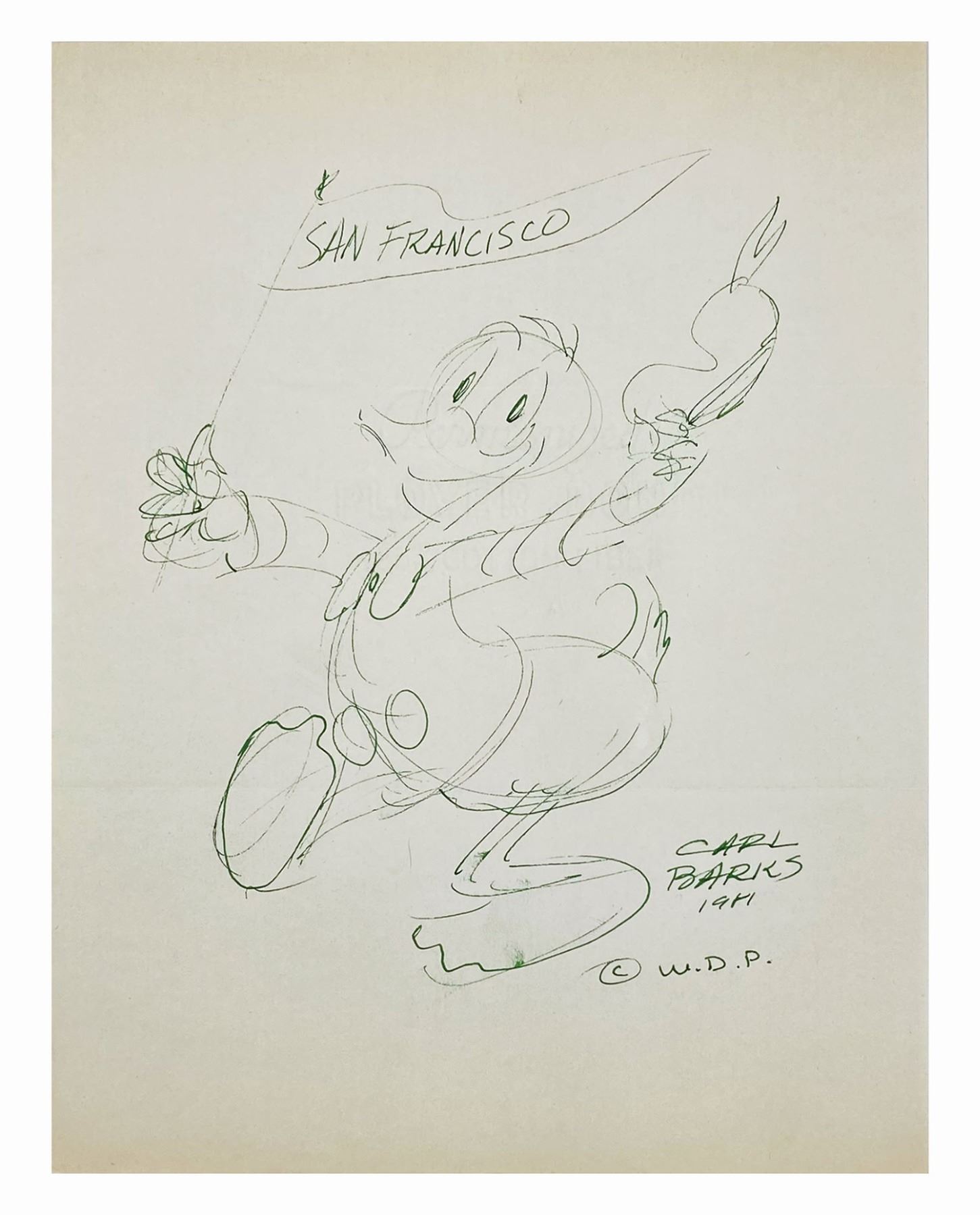 (Disney, 1981) An original ink drawing of Donald Duck by Disney Legend Carl Barks. The image depicts Donald waving a "San Francisco" pennant and is signed by Barks at the lower right corner. Additionally, Barks added a handwritten W.D.P. copyright below his name. Measuring 11"x8.5", the drawing is in very good condition. There is some smudging to the ink in Donald's foot which looks to be from the initial drawing process. There are two horizontal creases to the paper from prior folding.
