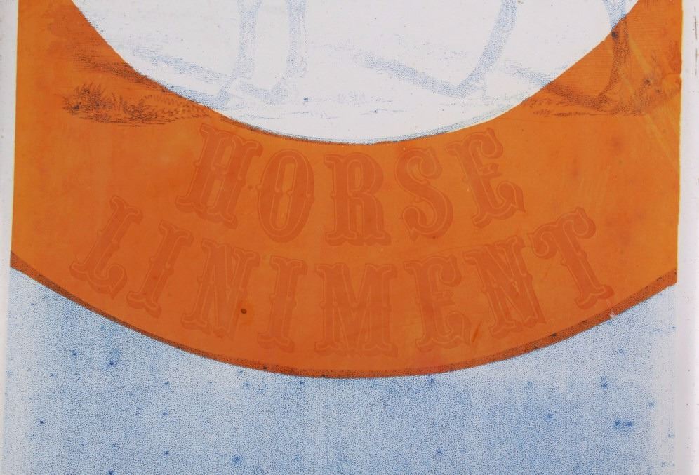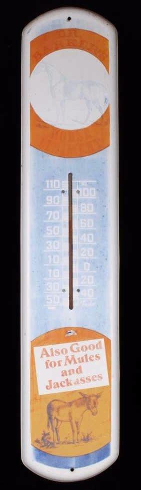 This is a original Dr. Barker's horse liniment advertisement tin lithograph thermometer sign. It features a custom advertisement lithograph design, set in the middle of the sign is a thermometer. The sign has a horse and donkey on its front and is marked "Dr. Barker's Horse Liniment Also Good for Mules and Jackasses Taylor 54810." The condition of the piece is good with the thermometer unbroken, but the lithograph is faded. It measures 39" H x 8 3/8" W