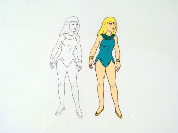 The Herculoids battled to defend their planet from menaces on Amzot/Quasar and from outer space. All of the Herculoids displayed Human-level intelligence - employing precision teamwork and complex tactics - as well as emotions, and Zandor and Tara both * displayed a working knowledge of complex alien technologies as well as the ability to pilot interstellar spacecraft—but essentially, Zandor, Tara, Dorno, and the Herculoids were fighting to keep Amzot/Quasar a technology-free, primitive planet. This is further * indicated by the pseudo-barbarian outfits of Zandor, Tara, and Dorno and the fact that technology was used mainly by the various villains, but rarely if ever by the heroes. Although the "speech" of their companions was limited and repetitive, Zandor, Tara * and Dorno demonstrated that Gloop and Gleep, at least, had a comprehensive mode of communication, and that they could at least understand and interpret this language. * * * * **The cel and drawing are at least 35 years old. * * * * It appears that something has caught Tara's attention... * * * Original Animation and Drawing * * Original "rough" animation drawing, in black pencil with the notations in black. * * * Overall Size of Drawing: 10 1/2" x 12 1/2" * Overall Size of the Cel: 10 1/2" x 12 1/2" * Excellent condition * This is an original hand-painted cel set-up used in the production of an episode of "Herculoids." Each one-of-a-kind set-up represents a slight change in position of the characters. When individually photographed and projected in rapid succession, the images * appear to move. * * To create production cels, the original animator's drawing is transferred onto an acetate cel (by hand-inking and/or photo copying). The cel is then hand-painted on the reverse side. * * The cel and drawing received by the winning bidder may be ever so slightly different from that in the auction photos. * * * * The drawing and cel are ready to be matted and framed. The notations are located at the bottom of the drawing and cel. * *