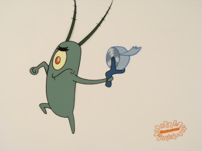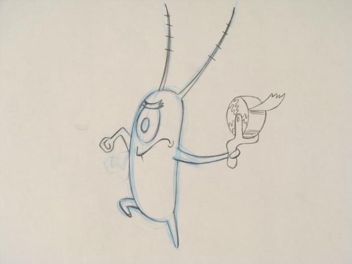 This original animation cel is from the Nickelodeon TV show SpongeBob Squarepants. The story takes place under the deep blue sea in Bikini Bottom, where SpongeBob resides. SpongeBob, who is a yellow, porous sponge, is your typical happy-go-lucky character, as he is always cheerful and enjoys making people laugh. Patrick Star, SpongeBob's neighbor who is a starfish, is your average children's show idiot, as he boasts knowing nothing and is often getting himself into ridiculous situations. Between the homes of these two lies the home of the miserable Squidward, a squid, who is known for being grouchy and playing tricks on SpongeBob and Patrick. Both SpongeBob and Squidward work at the Krusty Krab, a fast food business run by the greedy money-loving Mr. Krabs, a crab, the arch rival of the evil, possibly misunderstood, Plankton. Another neighbor, Sandy Cheeks, an athletic squirrel who normally wears an astronaut's space suit, was introduced in "Tea at the Treedome." She spends most of her time inventing and experimenting. Shown here is Plankton looking angry.Original Production Animated Cel and Drawing Original "rough" animation drawing, in black and non-photo blue pencil, with notations in black. Overall Size of Drawing: 10 1/2" x 12 1/2" Overall Size of Cel: 10 1/2" x 12 1/2" Very Good ConditionThis is an original hand-painted cel set-up used in the production of an episode of "SpongeBob SquarePants." Each one-of-a-kind set-up represents a slight change in position of the characters. When individually photographed and projected in rapid succession, the images appear to move.