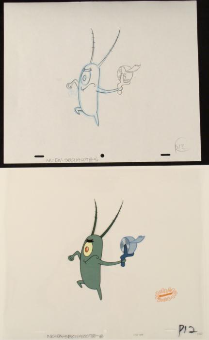 This original animation cel is from the Nickelodeon TV show SpongeBob Squarepants. The story takes place under the deep blue sea in Bikini Bottom, where SpongeBob resides. SpongeBob, who is a yellow, porous sponge, is your typical happy-go-lucky character, as he is always cheerful and enjoys making people laugh. Patrick Star, SpongeBob's neighbor who is a starfish, is your average children's show idiot, as he boasts knowing nothing and is often getting himself into ridiculous situations. Between the homes of these two lies the home of the miserable Squidward, a squid, who is known for being grouchy and playing tricks on SpongeBob and Patrick. Both SpongeBob and Squidward work at the Krusty Krab, a fast food business run by the greedy money-loving Mr. Krabs, a crab, the arch rival of the evil, possibly misunderstood, Plankton. Another neighbor, Sandy Cheeks, an athletic squirrel who normally wears an astronaut's space suit, was introduced in "Tea at the Treedome." She spends most of her time inventing and experimenting. Shown here is Plankton looking angry.Original Production Animated Cel and Drawing Original "rough" animation drawing, in black and non-photo blue pencil, with notations in black. Overall Size of Drawing: 10 1/2" x 12 1/2" Overall Size of Cel: 10 1/2" x 12 1/2" Very Good ConditionThis is an original hand-painted cel set-up used in the production of an episode of "SpongeBob SquarePants." Each one-of-a-kind set-up represents a slight change in position of the characters. When individually photographed and projected in rapid succession, the images appear to move.