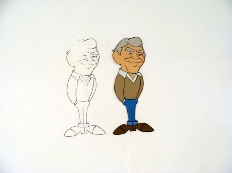 Mervyn Edward "Merv" Griffin, Jr. was an American television host, musician, actor, and media mogul. He began his career as a radio and big band singer who went on to appear in movies and on Broadway. * * * Original Animation Cel and Drawing Original "rough" animation drawing, in black with the notations in black. * Overall Size of Drawing: 10 1/2" x 12 1/2" Overall Size of Cel: 10 1/2" x 12 1/2" Condition: Cel - Excellent and Drawing - Good * * * This is an original hand-painted cel. Each one-of-a-kind cel represents a slight change in position of the characters. When individually photographed and projected in rapid succession, the images appear to move. * * To create production cels, the original animator's drawing is transferred onto an acetate cel (by hand-inking and/or photo copying). The cel is then hand-painted on the reverse side. * * * The cel and drawing are ready to be matted and framed. The animator's notations are at the bottom of both. Some of Merv's outline has been removed due to tape. *