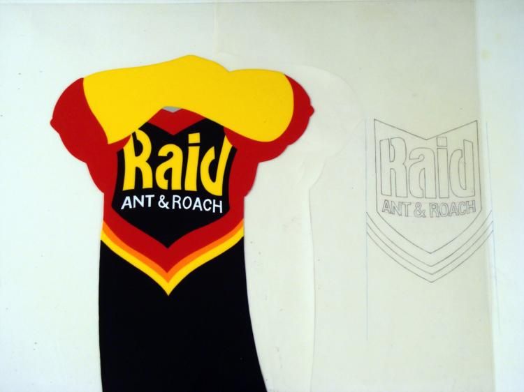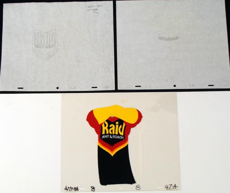 Raid Ant has been a family owned company since 1886 and been killing bugs ever since then. Offered here is a original production cel and matching drawing from the Raid Ant Commercial. * * * * * This can should do the trick for bug infestation problem... There is a partial matching drawing overlay that accompanies the cel. * * * Original Animated Cel and Drawing Original "rough" animation drawing, in black, blue, and red, with notations in black. * Overall size is a 12-field drawing that is 10 1/2" × 12 1/2"Overall Size of the Cel: 10 1/2" x 12 1/2" * * Excellent Condition * This is an original hand-painted cel set-up was used in the production of the Raid Ant Commercial. Each one-of-a-kind cel represents a slight change in position of the characters. When individually photographed and projected in rapid succession, the images * appear to move. * * To create production cels, the original animator's drawing is transferred onto an acetate cel (by hand-inking and/or photo copying). The cel is then hand-painted on the reverse side. * * * The cel and drawing are ready to be matted and framed. The animator's notations are at the top and bottom of the drawing and the bottom of the cel *