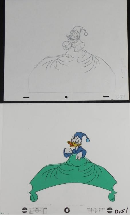 Donald Duck is a cartoon character created in 1934 at Walt Disney * Productions. Donald is an anthropomorphic white duck with a * yellow-orange bill, legs, and feet. He typically wears a sailor suit * with a cap and a black or red bow tie. Donald is most famous * for his semi-intelligible speech and his mischievous and irritable * personality. Along with his friend Mickey Mouse, Donald is one of the * most popular Disney characters and was included in TV Guide's list of * the 50 greatest cartoon characters of all time in * 2002. * * Get up Donald, it's time for work, stop hitting that snooze button... * Original Drawing and Animation * CelOriginal "rough" animation drawing in black and * non-photo blue with the notations in non-photo * blue * Size of cel: 10 1/2" x 12 * 1/2"Size of drawing: 10 1/2" x 12 * 1/2" * Overall Condition: Cel - Excellent * and Drawing - Very good; some creasing and surface wear * This is * an original hand-painted cel was used in the production of an * episode of "Donald Duck." Each cel represents a slight change in * position of the characters. When individually photographed and projected * in rapid succession, the images appear to move. * To create production cels, the original animator's drawing is * transferred onto an acetate cel (by hand-inking and/or photo copying). * The cel is then hand-painted on the reverse side. * * * The drawing and cel are ready to be matted and * framed. The animators * notations are located at the bottom of both *