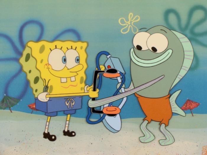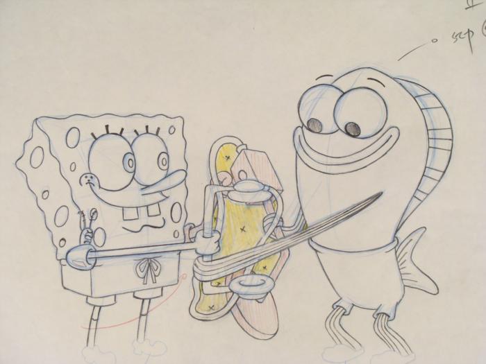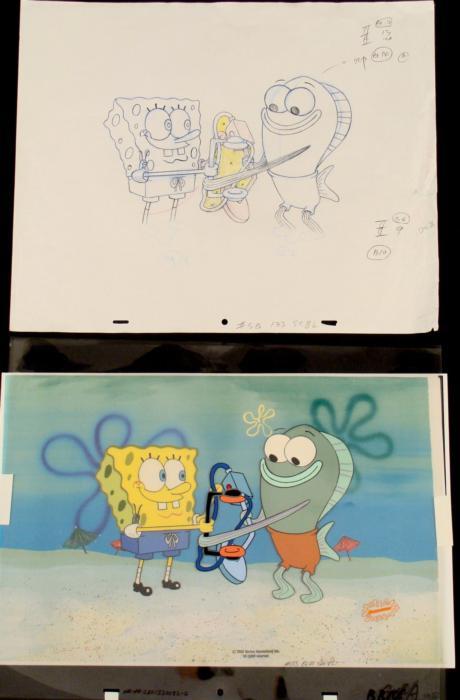 This original animation cel, drawing, and reproduction background are from the Nickelodeon TV show SpongeBob Squarepants. The story takes place under the deep blue sea in Bikini Bottom, where SpongeBob resides. SpongeBob, who is a yellow, porous sponge, is your typical happy-go-lucky character, as he is always cheerful and enjoys making people laugh. Patrick Star, SpongeBob's neighbor who is a starfish, is your average children's show idiot, as he boasts knowing nothing and is often getting himself into ridiculous situations. Between the homes of these two lies the home of the miserable Squidward, a squid, who is known for being grouchy and playing tricks on SpongeBob and Patrick. Both SpongeBob and Squidward work at the Krusty Krab, a fast food business run by the greedy money-loving Mr. Krabs, a crab, the arch rival of the evil, possibly misunderstood, Plankton. Another neighbor, Sandy Cheeks, an athletic squirrel who normally wears an astronaut's space suit, was introduced in "Tea at the Treedome." She spends most of her time inventing and experimenting. Here, Spongebob and a fish friend of his seem to have agreed upon sharing their metal dector. Original Production Animated Cel, Drawing, and Reproduction BackgroundOriginal "rough" animation drawing, in black and non-photo blue pencil, with notations in black, non-photo blue, and red. Overall Size of Drawing: 13 1/2" x 16 1/2" Overall Size of Cel: 13 1/2" x 16 1/2" Overall Size of Background: 11" x 17"Very Good ConditionThis is an original hand-painted cel set-up used in the production of an episode of "SpongeBob SquarePants." Each one-of-a-kind set-up represents a slight change in position of the characters. When individually photographed and projected in rapid succession, the images appear to move.