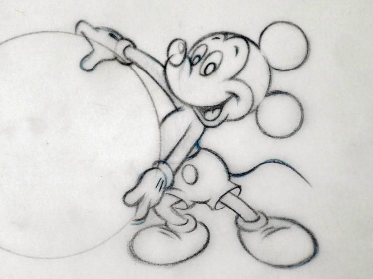 Mickey Mouse is a cartoon character created in 1928 by Walt Disney and Ub Iwerks at The Walt Disney Studio. Mickey is an anthropomorphic mouse and typically wears red shorts, large yellow shoes, and white gloves. He is one of the most recognizable cartoon