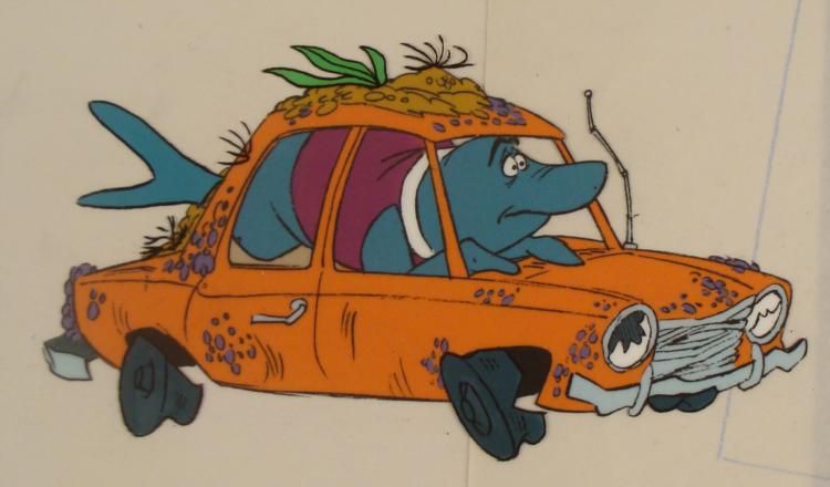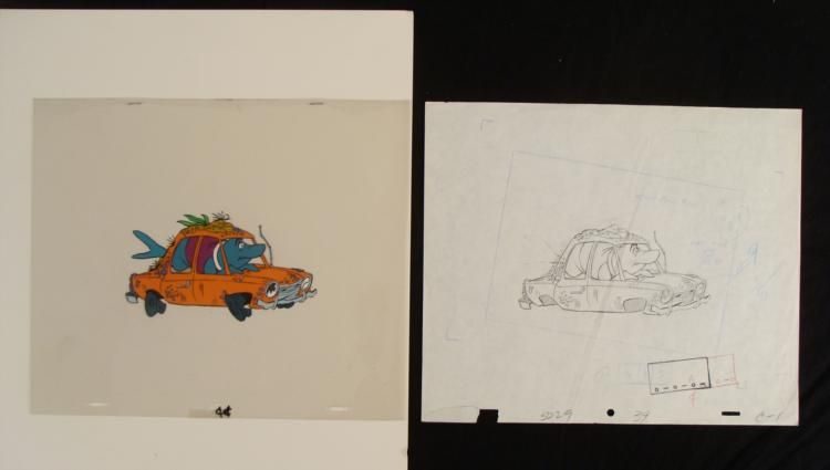 Here is an original animation cel and drawing used in the production of The Pink Panther Show cartoon, done at the studio of Friz Freleng. The program ran on television throughout the 1970's. It appears that Misterjaw is stuck in a broken down car. The cel comes with a preliminary sketch drawing. Original Animated Cel and DrawingOriginal "rough" animation drawing, in blue, red, and black with the notations in black and blueOverall size is a 12-field drawing that is 10 1/2" × 12 1/2" Excellent condition This is an original hand-painted cel set-up used in the production of an episode of "The Pink Panther Show." Each one-of-a-kind set-up represents a slight change in position of the characters. When individually photographed and projected in rapid succession, the images appear to move.To create production cels, the original animator's drawing is transferred onto an acetate cel (by hand-inking and/or photo copying). The cel is then hand-painted on the reverse side. The cel and drawing are ready to framed and matted. The animator's notations are shown at the top and bottom of the drawing and bottom of the cel. There is a small rip to the bottom of the drawing.