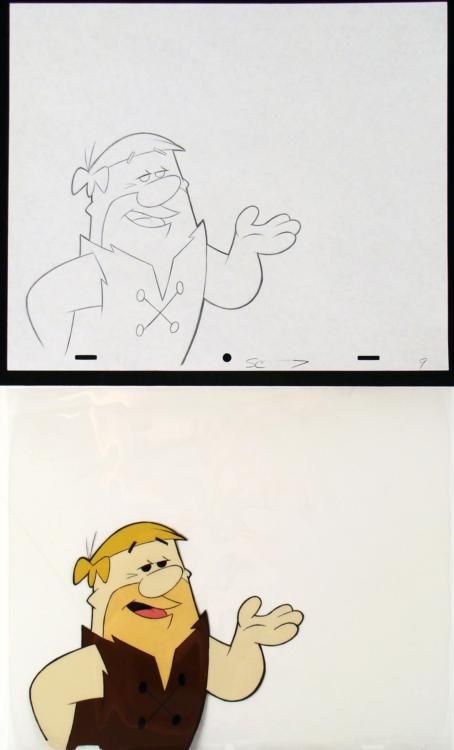The show is set in the Stone Age town of Bedrock. (In some of the earlier episodes, it was also referred to as "Rockville"). The Flintstones was about a working-class Stone Age man's life with his family and his next-door neighbor and best friend. The show's continuing popularity rested heavily on its juxtaposition of modern everyday concerns in the Stone Age setting. In this fantasy version of the past, dinosaurs, saber-toothed tigers, woolly mammoths, and other long-extinct animals co-exist with cavemen. Like their mid-20th century peers, these cavemen listen to records, live in split-level homes, and eat out at restaurants, yet their technology is made entirely from pre-industrial materials and largely powered through the use of various animals. For example, the cars are made out of stone, wood, and animal skins, and powered by the passengers' feet. Meh, no reason to thank me, that's what friends are for... Original Animation Cel and Drawing Original "rough" animation drawing, in black pencil with the notations in black Overall size is a 12-field drawing that is 10 1/2" × 12 1/2" Overall Size of Cel: 10 1/2" x 12 1/2"Excellent Condition This is an original hand-painted cel used in the production of an episode of "The Flintstones." Each one-of-a-kind cel represents a slight change in position of the characters. When individually photographed and projected in rapid succession, the images appear to move. To create production cels, the original animator's drawing is transferred onto an acetate cel (by hand-inking and/or photo copying). The cel is then hand-painted on the reverse side. The background accompanying this set-up is a reproduction background. The drawing and cel are ready to be matted and framed. The notations are located at the bottom of the drawing and cel.
