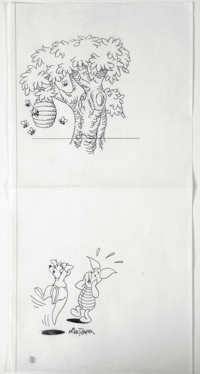 Offered here is an original Winnie the Pooh animation drawing of Pigglet and Roo signed by cartoon artist Mike Royer. Mike Royer helped launch a Winnie the Pooh licensing program in late 1993; for the latter, he was featured in a 43-minute video, How To Draw Pooh, sent to licensees. Royer had left his staff position in June 1993 to freelance full-time for Disney, primarily on Winnie the Pooh projects. Christopher Robin and his boy animals, have one adventure after another -everything from filching honey from the angry bees to welcoming Tigger (a very bouncy animal), consoling Eeyore (the gloomy donkey), enduring a flood, and seeking out the South Pole. Everything is related in extremely childish (but by no means "cutesy" terms), including bursts of poetry, rudimentary logic, and a great deal of remarkably in-depth character study. Each animal has a district personality: impulsive Tigger, neurotic Eeyore, no-nonsense Kanga, self-important Rabbit and Owl, humble Piglet, and, of course, direct and simple Pooh. The animals might be any group of typical siblings or playmates and teach, through their adventures, many real life lessons. Depicted here is Pigglet freaking out about the possibility of bee hive full of honey shaking loose while Roo seems extremely ecstatic that its going to fall... Original "rough" animation drawing in black pencil with the notations in black. Overall Size: 17" x 8 1/2" Signature: In pencil, bottom left Very Good condition; been folded in half Traditional animation is a multi-step process which includes various types of art techniques. Drawings are a key part of the process, in which the animator creates the design and movement of the characters. Drawings are then transferred onto acetate cels (by hand-inking and/or photo copying) to create a production cel, which is then hand painted on the back side, using paint colors chosen and approved by the creator of the series. This drawing is ready to framed and matted. The animator's notations are located at the bottom of the drawing. The drawing has been folded in half, the top half is of the tree with bees flying around the honey bee hive and at the bottom is Roo and Pigglet.