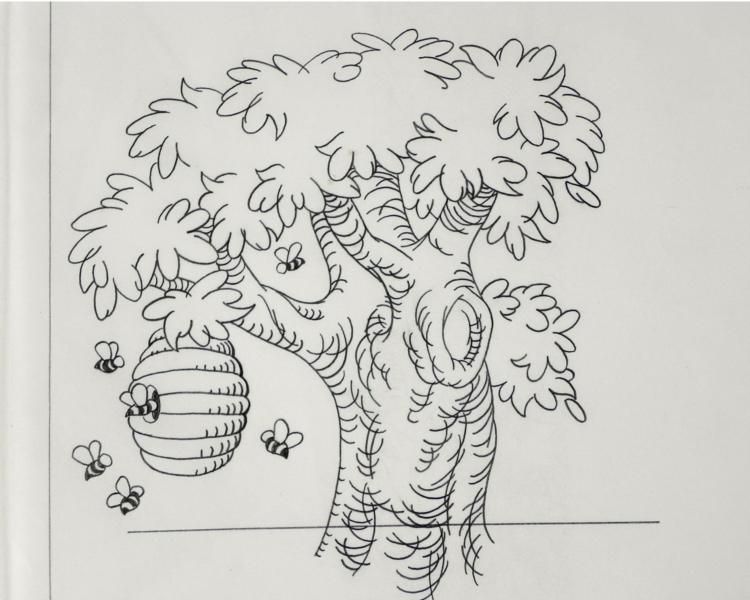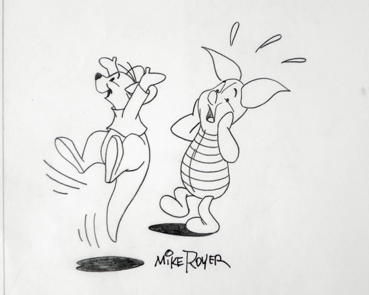 Offered here is an original Winnie the Pooh animation drawing of Pigglet and Roo signed by cartoon artist Mike Royer. Mike Royer helped launch a Winnie the Pooh licensing program in late 1993; for the latter, he was featured in a 43-minute video, How To Draw Pooh, sent to licensees. Royer had left his staff position in June 1993 to freelance full-time for Disney, primarily on Winnie the Pooh projects. Christopher Robin and his boy animals, have one adventure after another -everything from filching honey from the angry bees to welcoming Tigger (a very bouncy animal), consoling Eeyore (the gloomy donkey), enduring a flood, and seeking out the South Pole. Everything is related in extremely childish (but by no means "cutesy" terms), including bursts of poetry, rudimentary logic, and a great deal of remarkably in-depth character study. Each animal has a district personality: impulsive Tigger, neurotic Eeyore, no-nonsense Kanga, self-important Rabbit and Owl, humble Piglet, and, of course, direct and simple Pooh. The animals might be any group of typical siblings or playmates and teach, through their adventures, many real life lessons. Depicted here is Pigglet freaking out about the possibility of bee hive full of honey shaking loose while Roo seems extremely ecstatic that its going to fall... Original "rough" animation drawing in black pencil with the notations in black. Overall Size: 17" x 8 1/2" Signature: In pencil, bottom left Very Good condition; been folded in half Traditional animation is a multi-step process which includes various types of art techniques. Drawings are a key part of the process, in which the animator creates the design and movement of the characters. Drawings are then transferred onto acetate cels (by hand-inking and/or photo copying) to create a production cel, which is then hand painted on the back side, using paint colors chosen and approved by the creator of the series. This drawing is ready to framed and matted. The animator's notations are located at the bottom of the drawing. The drawing has been folded in half, the top half is of the tree with bees flying around the honey bee hive and at the bottom is Roo and Pigglet.