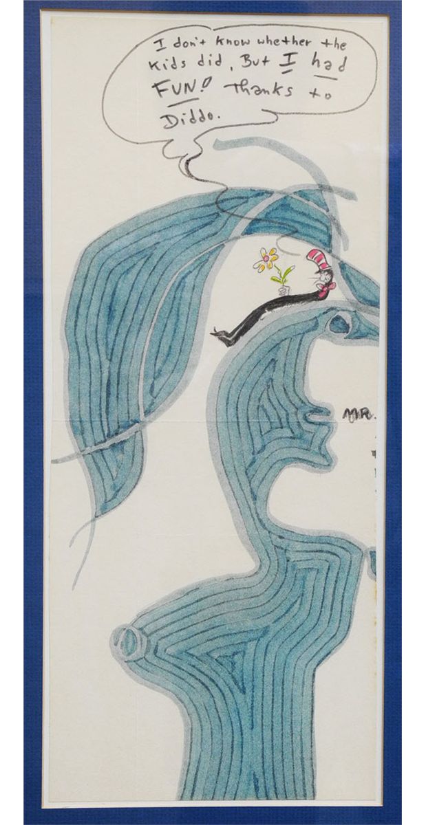 Dr. Seuss here draws his famous ''Cat in the Hat'' from the 1957 book of the same name. The children's book author adds his original art to a 1971 abstract drawing of a woman done by Diddo Clark, a friend of Seuss'. Dr. Seuss also adds a thought bubble for the Cat that reads, ''I don't know whether the kids did. But I had FUN! Thanks to Diddo.'' Clark, an undergraduate at the University of California at San Diego, taught a class for freshman on the pursuit of excellence in which Theodor Geisel (Seuss) was a guest speaker. Includes 5'' x 11.5'' mailing envelope, postmarked 18 November 1971 from Theodor Geisel's home address, mounted to a 20'' x 6.5'' mat. Very good condition. The 7'' x 16.75'' drawing is matted to an overall size of 9.25'' x 20''. Drawing has been folded for mailing, else fine.