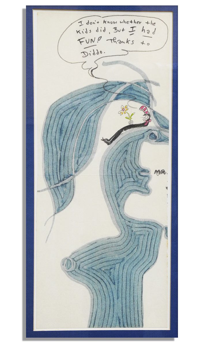 Dr. Seuss here draws his famous ''Cat in the Hat'' from the 1957 book of the same name. The children's book author adds his original art to a 1971 abstract drawing of a woman done by Diddo Clark, a friend of Seuss'. Dr. Seuss also adds a thought bubble for the Cat that reads, ''I don't know whether the kids did. But I had FUN! Thanks to Diddo.'' Clark, an undergraduate at the University of California at San Diego, taught a class for freshman on the pursuit of excellence in which Theodor Geisel (Seuss) was a guest speaker. Includes 5'' x 11.5'' mailing envelope, postmarked 18 November 1971 from Theodor Geisel's home address, mounted to a 20'' x 6.5'' mat. Very good condition. The 7'' x 16.75'' drawing is matted to an overall size of 9.25'' x 20''. Drawing has been folded for mailing, else fine.